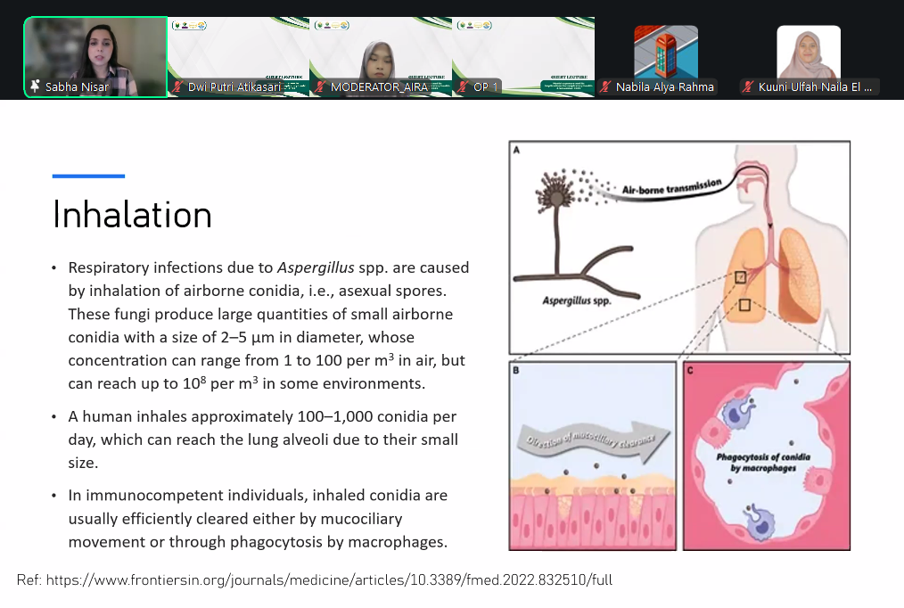 Dalam paparannya, Dr. Sabha Nisar menjelaskan bahwa jamur atau mould merupakan mikroorganisme yang tumbuh di lingkungan lembap dan hangat, serta dapat menghasilkan spora yang mudah terhirup manusia. Spora tersebut dapat menyebabkan berbagai gangguan kesehatan, mulai dari alergi ringan hingga infeksi paru-paru serius.