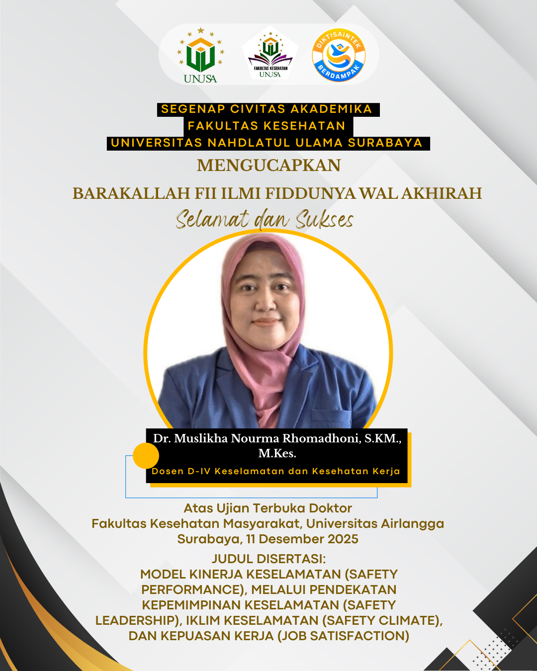 Civitas Aademika Fakultas Kesehatan UNUSA mengucapkan selamat atas tercapainya kelulusan ujian terbuka Dr Muslikha Nourma Rhomadhoni, S.KM., M.Kes dengan judul disertasi beliau mengenai “MODEL KINERJA KESELAMATAN (SAFETY PERFORMANCE), MELALUI PENDEKATAN KEPEMIMPINAN KESELAMATAN (SAFETY LEADERSHIP), IKLIM KESELAMATAN (SAFETY CLIMATE) DAN KEPUASAN KERJA (JOB SATISFACTION)”, di program studi S3 Kesehatan Masyarakat, Fakultas Kesehatan Masyarakat, Universitas Airlangga Surabaya.